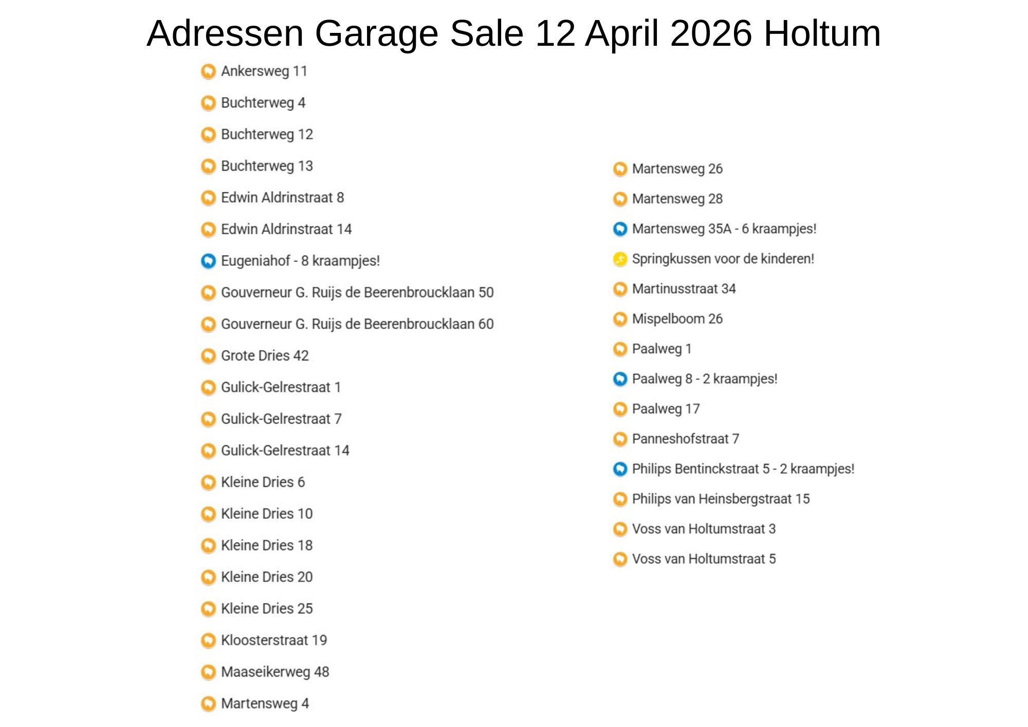 Bij deze alle adressen die komende zondag 12 April te vinden zijn in Holtum met de leukste koopjes. Alle adressen hebben ballonnen ophangen, zodat je goed kunt zien waar iemand staat.